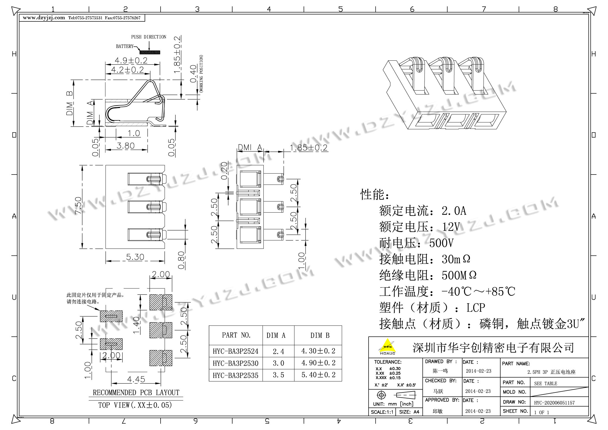 2.5PH 3PIN 正压电池座